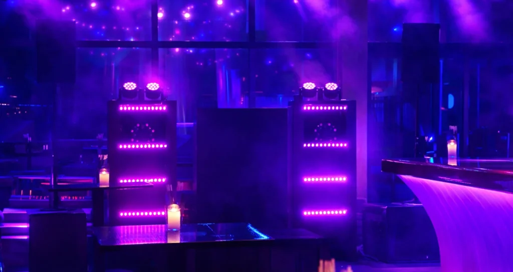 Sfeerverlichting Denk aan LED-paren, movingheads of wash-verlichting die de ruimte in de juiste kleur zet. Sfeerverlichting zorgt ervoor dat de zaal meebeweegt met de muziek — rustig en warm tijdens het diner, levendig en dynamisch zodra het feest losbarst.